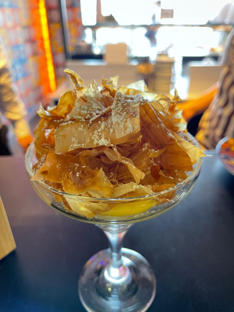 Crema chantilly al profumo di cannella stratificata con crumble di biscotto al burro, cubetti di arancia e sfoglia riccia caramellata