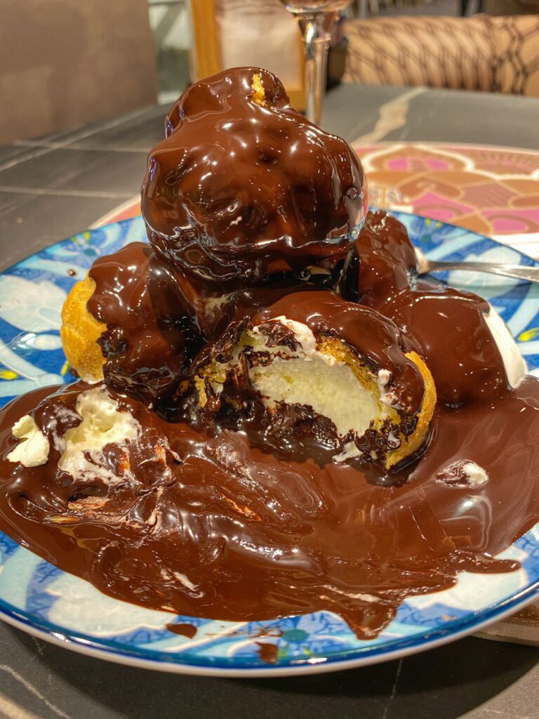 Profiteroles servito al piatto pronto per essere fuso con golosissima cioccolata da versare direttamente sui profiteroles