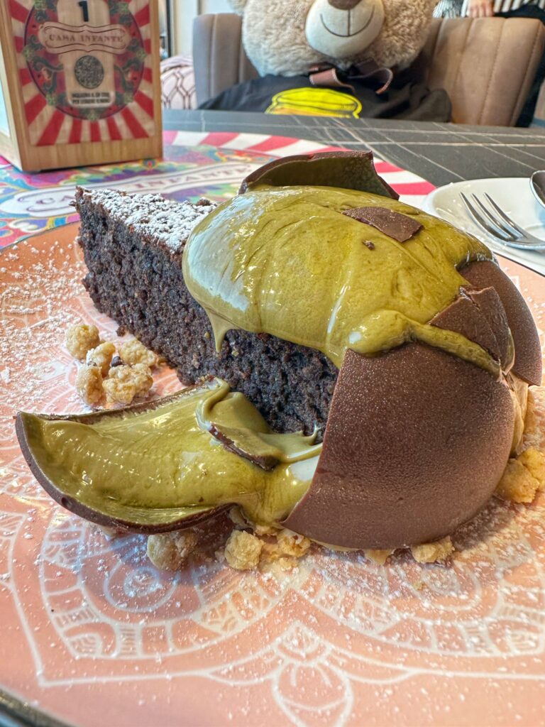 Soffice torta al Cioccolato e Mandorle con semisfera di Cioccolato ripiena di Pistacchiato