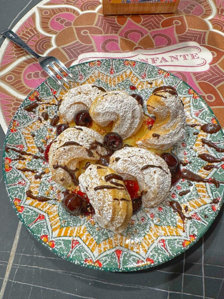 Crema Pasticcera variegata con Confettura di Amarene Fabbri, Crema Spalmabile al Cioccolato Fondente e Granella di Amaretto. Guarnito con Pezzettoni di Zeppola