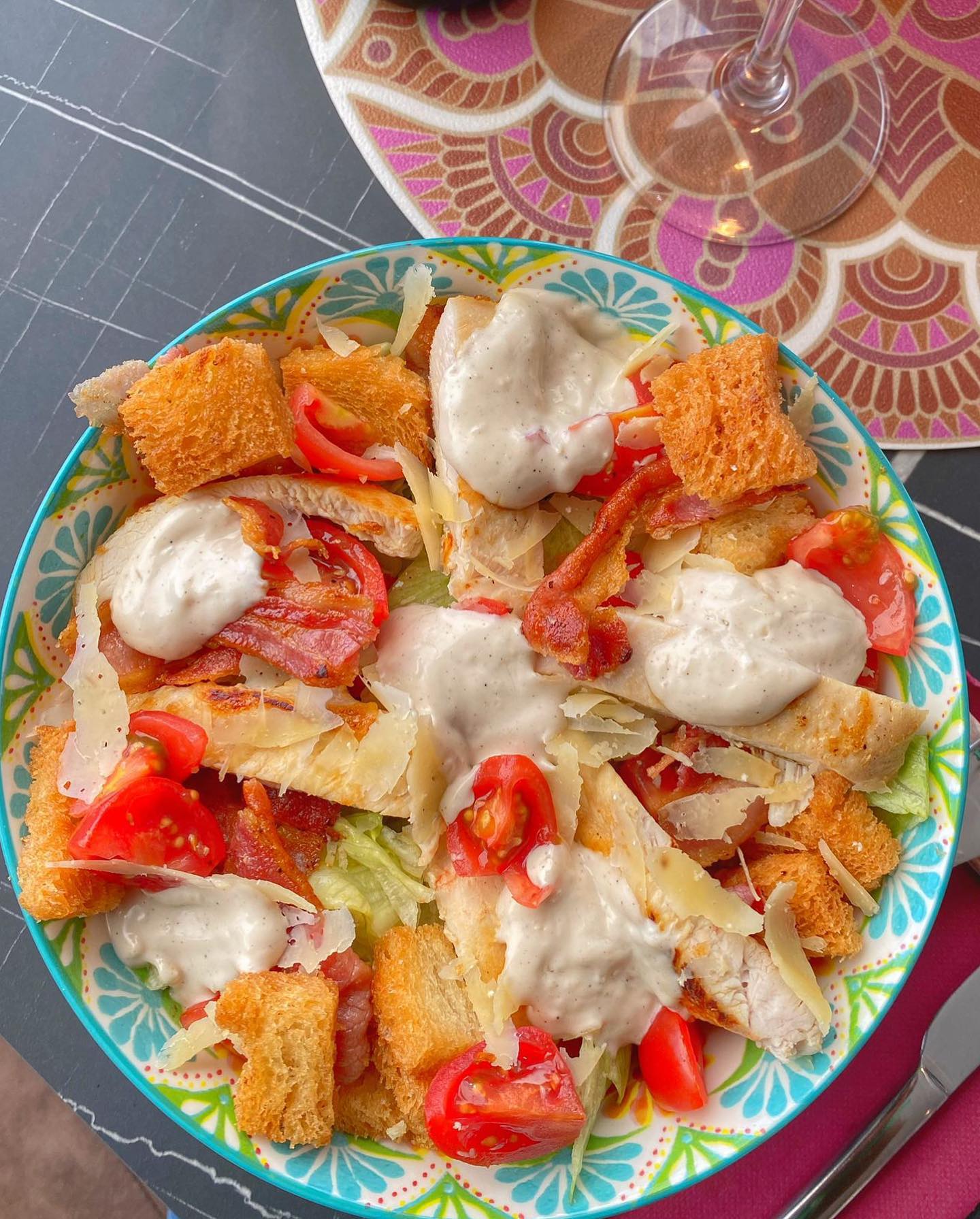 Pollo – Insalata – Bacon – Pomodori – Salsa Caesar servito con crostini di pane