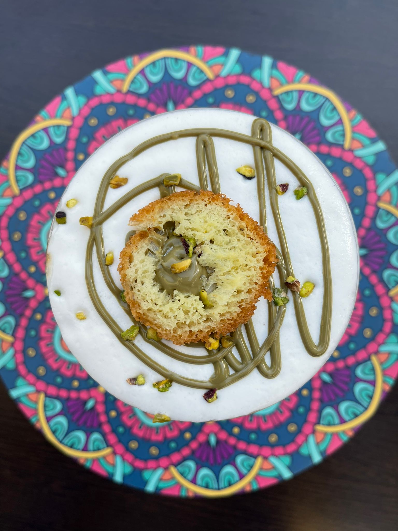 Crema al latte montata alla vaniglia, strato di pistacchiato, dolce 081, crema di caffè fredda e granelle di pistacchi