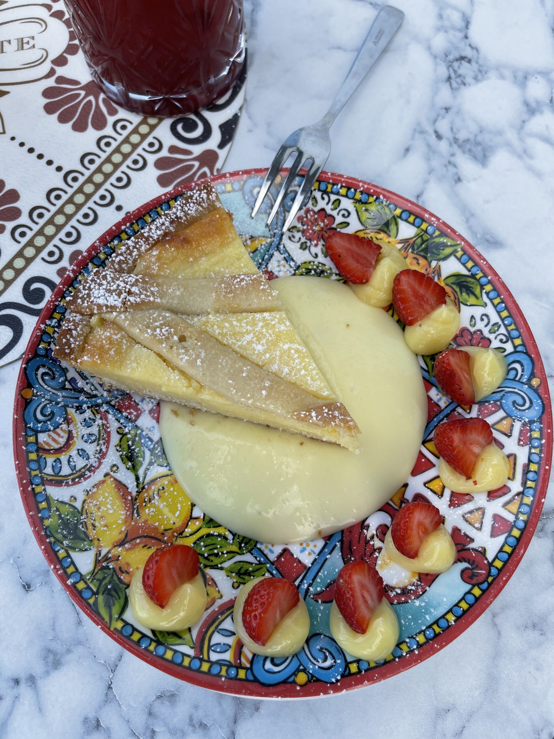 Crostata al limone su letto di salsa al limone e decorata con ciuffetti di crema pasticciera e fragole